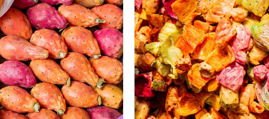 Ce qui rend la figue de Barbarie vraiment unique, c’est son fruit. Elles ont une forme caractéristique, ovale ou en poire, et sont recouvertes de petites épines. La couleur de la peau peut varier du vert au rouge ou à l’orange, selon le degré de maturité. Les épines peuvent être assez pointues, leur manipulation nécessite des précautions, alors ne vous embêtez pas et essayez-les déjà pelées.